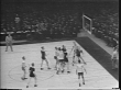 Panning view of University North Carolina Tar Heels playing New York University Violets at Madison Square Gardens in New York City, John Dillon / stands full of fans / high angle view of game, Sidney Tanenbaum scoring / fans cheering / Close-up of North Carolina with possession / John Dillon passing to Jim Jordan, who scores / Howard Sarath running and shooting three point shot / cheering crowd / montage of UNC players handling ball / Fans standing and cheering / score board showing UNC leading NYU / Frank Mangiapane rebounding and scoring / players on UNC jumping up in frustration / scoreboard showing NYU and UNC scores / NYU trying to score, players fighting for ball as it goes out of bounds and ends the game / various angles of UNC team and fans celebrating on court.