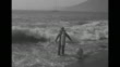 Card: "Paramount News Issue No. 13" / Title superimposed on two men, one in a 'frogman' suit, "Swims the Golfer Gate Under Water" / Elevated view of a muscular fitness enthusiast Jack LaLanne running on a beach and doing pushups, and jumping up and down / With an assistant, LaLanne is helped into the cumbersome rubberized diving suit / A closer view of him as he puts on the bulky rubber 'helmet' and a closeup of a large wristwatch / With a single air tank, and a tracking balloon, he walks into the waves / behind them, spectators, row boats on a choppy shoreline under the bridge / Boat: "Official boat, Jack LaLanne under water" / VS a wide view of the bridge and cameramen amid rigging / The waiting boat at the base of the bridge with Jack and the boat / Men congratulate him with the bridge far above them, then he flexes his muscles and yawns / Note: exact day not known