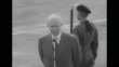 Title card: "Paramount News Issue No 33" / title "4 Days of History -Western Leaders Make Major Decisions in Bermuda" superimposed over French Pres. Joseph Laniel, US Pres. Dwight Eisenhower, and British Prime Minister Winston Churchill seated; photographer moves into shot / French, British, and US flags flying from poles, man on roof, crowd on ground / Eisenhower shakes hands with Churchill; officers and others in shot including officers in white uniform; Eisenhower walks to shake hands with Britain's Foreign Secretary Anthony Eden, then with Laniel / MS women and man holding up cameras in small crowd / leaders, Secretary of State John Dulles shaking hands with Churchill; then Eden / Eisenhower walks to microphone / crowd / SOT Eisenhower saying better understanding will come from meeting / MS women waving and smiling / Eisenhower smiling / he walks to car, shakes hands with officer, Churchill behind him; they get into car which is open in back / car driving away / Eisenhower, Churchill, and Laniel on porch / photographers probably in front of porch / leaders sitting, porch behind them / CU Eisenhower; pan to Churchill / leaders