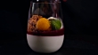 Fresh kiwi and mango fruits, gold sequin cherry putting to the glass of parfait dessert. Fast forward