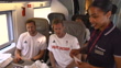 Charles (Charlie) Elwes (Team GB, Rowing) and Morgan Bolding (Team GB, Rowing) speaking across aisle, Eurostar staff arrive pushing drinks cart loaded with Nyetimber sparkling wine / Eurostar staff pouring and serving Nyetimber sparkling wine to Team GB athletes / Tom Digby (Team GB, Rowing) / Eurostar staff pouring and serving sparkling wine to Team GB athletes including Sholto Carnegie (Team GB, Rowing) / Team GB Rowing Men's 8s squad toasting with glasses /