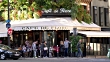 View of the iconic Cafe de Flore, a landmark in the Saint-Germain-des-Pres quarter, as tourists and locals crowd the busy street corner