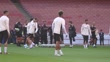 LONDON, ENGLAND - APRIL 28: Paris Saint-Germain's Arnau Tenas, Bradley Barcola, Khvicha Kvaratskhelia and other teammates warm up during a training session ahead of their UEFA Champions League semifinal match against Arsenal at Emirates Stadium on April 28, 2025 in London, England. (Footage by Niche Sport Media/Niche Sport Media via Getty Images)