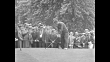 Title card: "Parks Wins Golf "Open'" / Aerial gallery on golf green at Oakmont Country Club at 1935 US Open / MS Jimmy Thompson tees off with gallery behind him / MS Walter Hagen tees off / MS gallery crosses green / MS Gene Sarazen putts and sinks ball / MS Thompson putts and sinks ball / MS camera follows ball as Sam Parks putts and misses / MS Gallery runs across green, more gallery in foreground / Aerial gallery encircling green as golfer putts / MS Parks, the winner, picks up ball off green and seated gallery rises