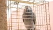 Parrot scratches and looks at camera inside its cage. Animal pets, birds