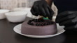 A pastry chef with black gloves decorates a cake while working in a pastry shop. She puts blueberries and almonds over the cake - 4K stock video