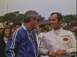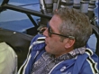 Paul Newman wearing dark sunglasses and striped blue jacket, watching car race / Paul Newman holding sunglasses over visor of racing helmet / zoom out to Newman sitting in CanAm race car with professional race car driver Bob Bondurant / Young white men wearing matching blue SmithDeser shirts pushing CanAm racer through crowd / Newman and Bob Bondurant sitting in race car, removing helmets / Newman and Bondurant sitting and talking in racer / Newman getting out of racer, talking with Bondurant, adoring crowd watching on.