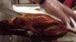 Peking duck is a dish from Beijing (Peking) that has been prepared since the imperial era. The meat is characterized by its thin, crisp skin, with authentic versions of the dish serving mostly the skin and little meat, sliced ​​in front of the diners by the cook. Ducks bred specially for the dish are slaughtered after 65 days and seasoned before being roasted in a closed or hung oven. The meat is often eaten with spring onion, cucumber and sweet bean sauce with pancakes rolled around the fillings . Sometimes pickled radish is also inside, and other sauces (like hoisin sauce) can be used.