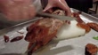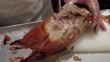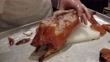 Peking duck is a dish from Beijing (Peking) that has been prepared since the imperial era. The meat is characterized by its thin, crisp skin, with authentic versions of the dish serving mostly the skin and little meat, sliced ​​in front of the diners by the cook. Ducks bred specially for the dish are slaughtered after 65 days and seasoned before being roasted in a closed or hung oven. The meat is often eaten with spring onion, cucumber and sweet bean sauce with pancakes rolled around the fillings . Sometimes pickled radish is also inside, and other sauces (like hoisin sauce) can be used.