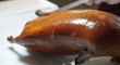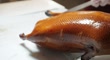 Peking duck is a dish from Beijing (Peking) that has been prepared since the imperial era. The meat is characterized by its thin, crisp skin, with authentic versions of the dish serving mostly the skin and little meat, sliced ​​in front of the diners by the cook. Ducks bred specially for the dish are slaughtered after 65 days and seasoned before being roasted in a closed or hung oven. The meat is often eaten with spring onion, cucumber and sweet bean sauce with pancakes rolled around the fillings . Sometimes pickled radish is also inside, and other sauces (like hoisin sauce) can be used.