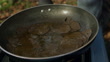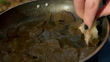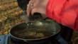 A woman slices a black truffle into a frying pan with butter and then eats with torn up bread in a UK woodland. (FKAC235A - 333269)