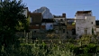 People on cherry tree terraces and back of Benialà village houses with hills - 4K stock video
