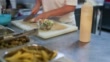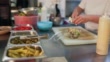 Woman who work in fast food restaurant preparing Caesar salad on stainless steel table surrounded with ingredients. She is dressing and adding ingridients in box for food delivery