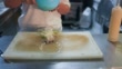 Woman who work in fast food restaurant preparing Caesar salad on stainless steel table surrounded with ingredients. She is dressing and adding ingridients in box for food delivery