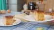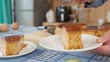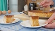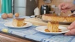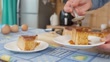 Slow motion footage showing a person's hands pouring caramel sauce with a spoon over a delicious slice of flan, also known as crème caramel