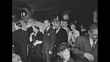 Title card: "Petrillo Host at Party for Unions' Blind" superimposed over group of blind musicians entering the annual Christmas party for blind American Federation of Musicians members / WS blind musicians file into the Crystal Ballroom at the Blackstone Hotel for the party / AFM president James Petrillo walks past camera as he arrives; he turns and smiles, then gestures to someone off-camera / tilt-down and pan party attendees sit down at round tables / Petrillo sits in front of Christmas tree with a female helper to distribute gifts to a line of people stretching to foreground; a woman plays cello in the background / CU Petrillo hands stocking full of gifts to boy and pats his shoulder as Santa Claus looks on from behind Petrillo / Petrillo hands stocking to a young black girl as men in sunglasses stand behind them / Santa watches as boy takes stocking from Petrillo and departs / side LS Petrillo sits at long table at front of room while others eat at the table / blind musicians, seated at round table, applaud / montage party attendees, also seated at round tables, applaud