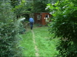 Philip Pullman (author of Dark Materials trilogy) and two dogs along to shed in garden