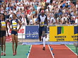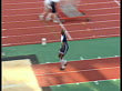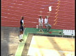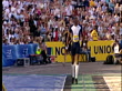 Phillips Idowu (Great Britain and Northern Ireland), hair bleached peroxide blonde with red stripe, celebrates by pretending to be a bull after landing in sand pit, Men's Long Jump, 2004 Crystal Palace Athletics Grand Prix, London