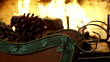A sleigh of pine cones rests in front of a rolling fire. Clip loops.