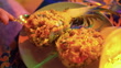 Pineapple fried rice, a popular southeast asian dish, is being served on a plate in a restaurant, showcasing its vibrant colors and tropical presentation