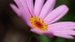Pink daisy common flower macro in light wind video 4K 60p. Flower is positioned at the bottom of the frame to allow copy space above. Detail of pink leaves yellow pollen on dark background