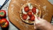 A pizza margherita on a wooden pizza paddle having red pepper flakes applied
