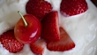 Hand of person garnishing the nutritious food with a Rainier Cherry