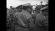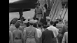 FS plane taxis on tarmac / CU General MacArthur confers with General Walker / CU Vandenberg and Collins walk down plane stairs / CU MacArthur greets arriving generals / LS press and military party at plane, then pan as all move away from plane / LS as party enters automobiles, surrounded by press corps, and drives away / Note: exact day not known