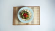 MS HA Plate with vegetables and tofu artfully arranged being served onto mat - HD stock video