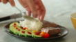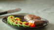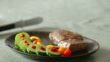 Plating two sous vide cooked and browned rump steak on plate with sliced cucumber topped with chili sauce next to layer of small and colourful decorative tomatoes. Brownish plate on gray tablecloth.