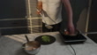 Salmon in spice crust served with beans and tomato butter. Preparation step. Placing cooked chopped flat beans on black slate. Plating spice crusted salmon fillet on top. Using slotted spatula. Tomato butter sauce in saucepan.