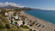 Playa de Burriana beach and Mediterranean sea with the Sierra mountains in the background at Nerja on the south coast of the Costa del Sol in Spain.