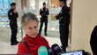 PARIS, FRANCE - MARCH 24: Police stand nearby as Actress Anouk Grinberg addressed the press, saying: "Assous (Depardieu's lawyer) has said another filthy thing, a dirty thing, to smear women, to obstruct justice" after being forced to leave the courtroom during Gérard Depardieu's sexual assault trial on March 24, 2025 in Paris, France. The trial of Gérard Depardieu, accused of sexually assaulting two women during the filming of a movie in 2021, opened today after a five-month postponement for health reasons.(Footage by Photo and Co/Getty Images)
