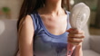 asian woman sweating in summer heat using portable fan to cool down feeling hot and uncomfortable