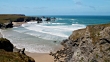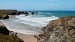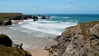 Looking down on Porthcothan beach, a beautiful sandy bay south of Constantine Bay and near Padstow in the North West of Cornwall, England. Viewed from the South West Coast Path. The beach was used in filming the TV drama Poldark, to represent Nampara land.