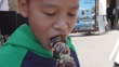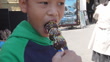 4K footage Front view Close-up Portrait Asian young boy enjoys candied Chocolate-Covered Strawberry Skewer in front street food stall at Oshino Hakkai village.