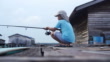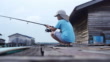 Portrait of Asian child with fishing rod on a wooden pier and fish at the sea. Nature, outdoors, childhood concept. - 4K stock video