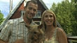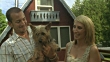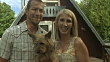 MS, Portrait of couple holding Australian Terrier standing in front of holiday cabin, Fish Creek, Wisconsin, USA - HD stock video