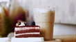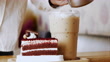 4K footage front view coffee shop staff Pour the milk froth over the iced espresso and chocolate cake on the table.