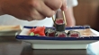 A static shot of a diner pouring a few drops of soy sauce on sushi.