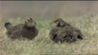 Prairie chickens peck around a grassy field and circle each other. - stock video