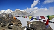 View from the top of Gokyo Ri (5400m) with its numerous Tibetan Buddhism prayer flags above the village of Gokyo in the Himalayas in Nepal
