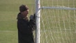 Premier League matches; WALES: Newport: EXTTILT DOWN pitch and standsPULL FOCUS Welsh and Newport County flags.Workers setting up goalsMan mowing pitchWorker attaching netSeats in stands