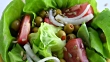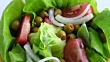 Adding salted sunflower seeds. The dish has tomato slices, white onion small pieces, and green stuffed olives. Salads have many health benefits including being a source of dietary fiber, helping weight control, and protecting heart health
