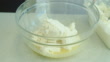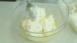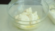 Stirring cottage cheese and eggs, for making cheesecakes.
