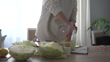 Hands of a woman chopping white cabbage with a kitchen knife on a cutting board. Preparing fresh vegan fermented pickles. Fresh vegetable salads are good for health. Healthy lifestyle concept