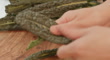 close view of hand trimming cavolo nero on wooden chopping board