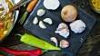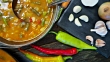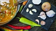 Homemade vegan minestrone soup and ingredients for preparing it on the table. Close-up overview