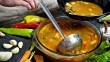 Preparing vegan minestrone with green beans and fresh herbs. Serving a portion of the soup. Close-up view