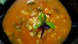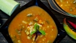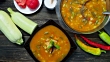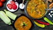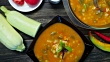 Homemade vegan minestrone soup and ingredients for preparing it on the table. Close-up overview